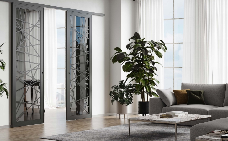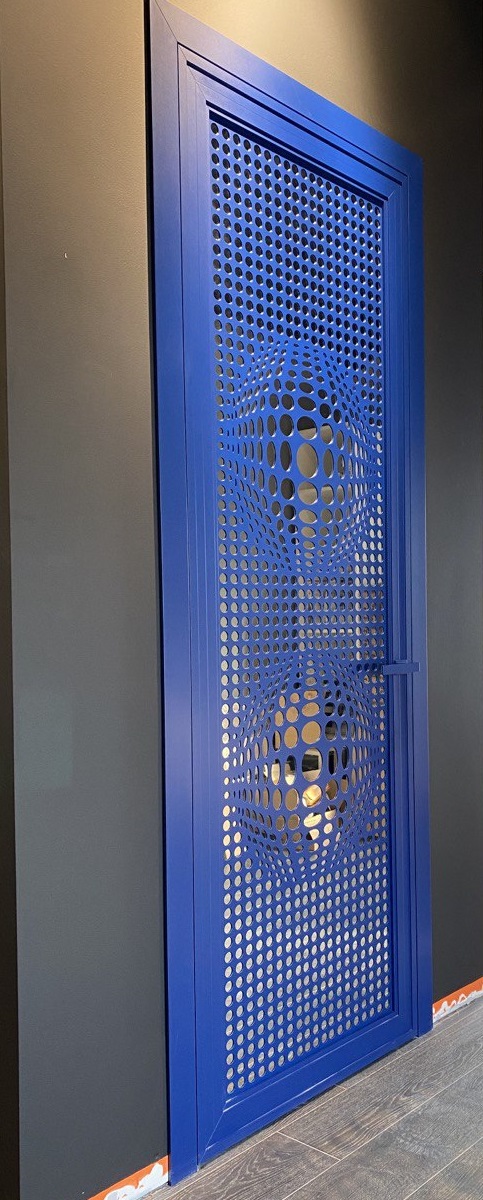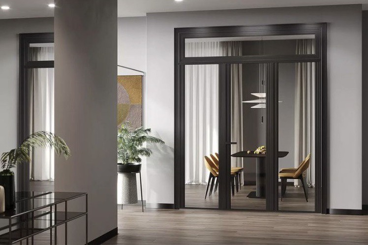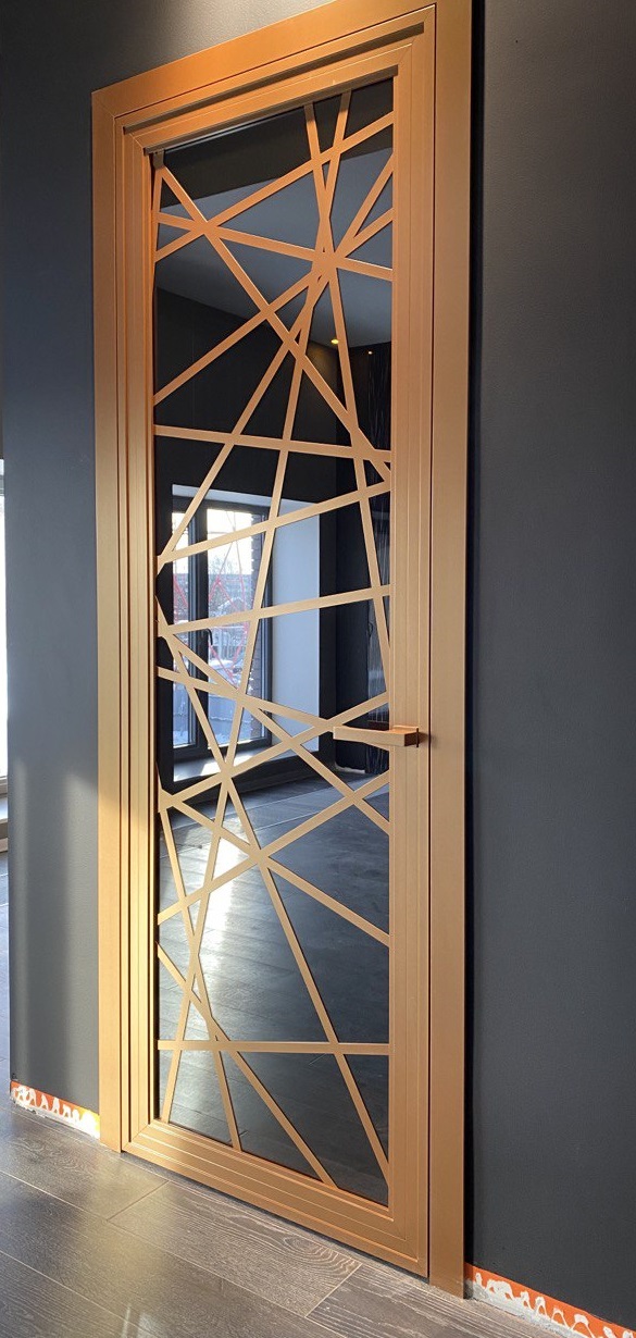 Двери выполнены из алюминиевого профиля под одинарное остекление, сочетает в себе ключевые тренды современного интерьера, качество и функциональность. Оригинальный дизайн дверному полотну придает многогранная форма профиля. А итальянская фурнитура добавляет комфорта и стиля.